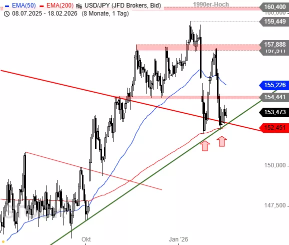 Die Stabilisierungsbewegung des Japanischen Yen gegenüber dem US-Dollar an der Kreuzunterstützung aus Aufwärtstrendlinie, alter Abwärtstrendlinie und EMA200 dauert an. Nach wie vor hätten die Bullen gute Chancen, von hier aus eine neue Aufwärtswelle einzuleiten. Werden die Zwischenhochs der letzten Tage überwunden, eröffnet sich Erholungspotenzial. Kritisch wäre hingegen ein Bruch der Kreuzunterstützung zu werten, dann entstünden Verkaufssignale für eine weitere Abwärtskorrektur.