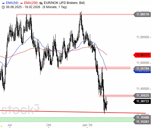 Mit der Verkaufswelle seit Ende Dezember krachte der Euro gegenüber der Norwegischen Krone bis ans untere Ende der seit bald drei Jahren andauernden Seitwärtsbewegung zurück. Hier sollte es zu einer nachhaltigen Stabilisierung kommen, im besten Fall startet sogar eine größere Kurserholung. Ein nachhaltiger Anstieg über die Hürde bei 11,34 - 11,36 NOK würde erste Impulse liefern. Vorher wäre aber auch noch ein Test des Supports bei 11,15 - 11,19 NOK denkbar.