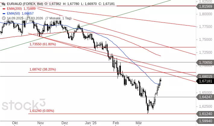 EUR/AUD erholt sich seit dem Tief vom 11. März bei 1,6124 AUD deutlich. Gestern überwand das Währungspaar den EMA50 (Tagesbasis). Heute erreicht er fast den Widerstand bei 1,6082 AUD. Damit beginnt ein großer Widerstandsbereich, an dem die Erholung zu Ende gehen kann. Anschließend wären Abgaben bis 1,6124 und 1,5994 AUD möglich. Mit einem Ausbruch über 1,6975 AUD würde sich aber weiteres Aufwärtspotenzial in Richtung 1,7355 und 1,7837 AUD ergeben.