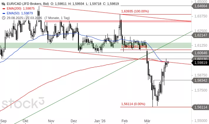 EUR/CAD bildete nach dem Tief vom 09. März einen kleinen Boden aus und erholte sich anschließend. Seit drei Tagen hängt das Währungspaar am Widerstandsbereich zwischen 1,5988 und 1,6013 CAD fest. Prallt das Währungspaar an diesem Bereich ab, dann könnte es zu Abgaben bis 1,5834, 1,5611 und sogar 1,5375 CAD kommen. Ein Ausbruch würde die Erholung erst einmal nur verlängern. Erst ein Ausbruch über 1,6151 CAD würde die Chance eröffnen, dass aus der Erholung eine stabile Aufwärtsbewegung wird.