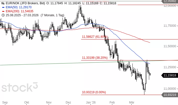 EUR/NOK stand ab Mitte Dezember 2025 deutlich unter Druck und durchbrach den Aufwärtstrend seit Juli 2023. Am 19. März kam es zu einem Tief bei 10,9322 NOK. Danach schoss das Währungspaar an den gebrochenen Abwärtstrend nach oben. In den letzten Tagen kommt es aber bereits wieder zurück. EUR/NOK kann in den nächsten Tagen und Wochen noch in Richtung 10,7032 NOK oder sogar ca. 10,40 NOK abfallen. Erst ein stabiler Ausbruch über das Hoch vom Dienstag bei 11,3402 NOK würde weitere Erholungschancen in Richtung 11,5863 NOK eröffnen.