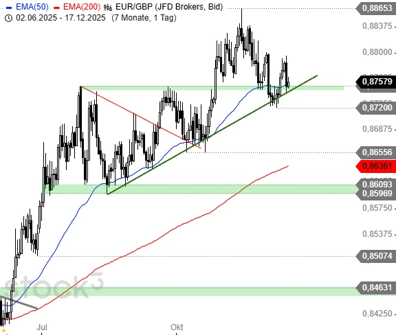 In der vergangenen Woche stabilisierte sich der Euro gegenüber dem Britischen Pfund an der Aufwärtstrendlinie der letzten Monate und prallte dort nach oben hin ab. Gestern kam es dann zu einem schwungvollen Rückschlag, EUR/GBP krachte in den Bereich der Aufwärtstrendlinie und des EMA50 zurück. In einem bullischen Szenario startet von hier aus eine neue Aufwärtsbewegung, die den Wert früher oder später auch wieder in Richtung Jahreshoch trägt.