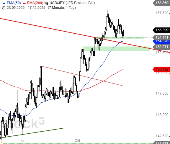 Im gestrigen Handel fiel der US-Dollar gegenüber dem Japanischen Yen weiter zurück und erreichte den Support bei 154,44 JPY, von wo aus der Wert wieder deutlich nach oben schießt. Im Grunde könnte von hier aus bereits eine neue Aufwärtswelle starten, alternativ kommt es noch zu einem Test des EMA50 und der gebrochenen Abwärtstrendlinie. Mittelfristig bleibt eine Trendfortsetzung gen Norden das Idealszenario.