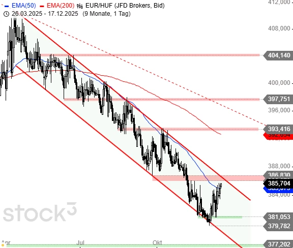 Die Erholung des Euro gegenüber dem Ungarischen Forint dauert an, das Währungspaar nähert sich dem Kreuzwiderstand bei 386 - 387 HUF. Dort könnte sich die Marschrichtung der kommenden Wochen entscheiden. Verlässt EUR/HUF den Abwärtstrendkanal der letzten Monate nach oben hin, eröffnet sich die Chance auf eine größere Kurserholung. Ein deutliches Scheitern hingegen könnte die Bären wieder motivieren.