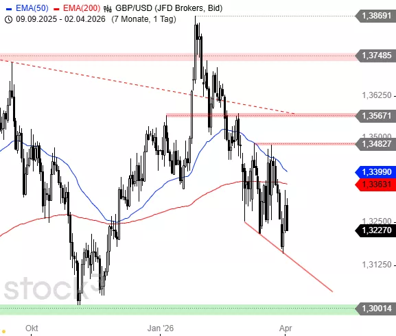 Nach einem neuen Jahrestief am Dienstag erholte sich das Britische Pfund gegenüber dem US-Dollar kräftig, heute geht es wieder nach unten. Die gestrigen Gewinne werden im frühen Handel zurückgenommen. GBP/USD bleibt damit anfällig für erneut fallende Kurse zum Jahrestief und zur knapp darunter gelegenen Pullbacklinie der vergangenen Wochen. Auf der Oberseite treffen weitere Erholungsversuche an den beiden EMAs auf Widerstand. Für Bodenbildungsversuche müssten diese beiden gleitenden Durchschnittslinien überwunden werden.