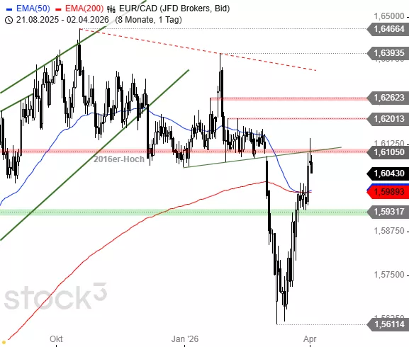 Die steile Rallybewegung des Euro gegenüber dem Kanadischen Dollar erreichte und überwand gestern das alte 2016er-Hoch, wo auch die Zwischentiefs von Dezember bis Februar gelegen hatten. Nach einem bärischen Reversal kommt es heute zu einem Rücksetzer. Eine Abwärtskorrektur bis zu den beiden EMAs oder zur 1,5932-CAD-Marke könnte damit folgen. Für größere Kaufsignale nach dem starken V-Reversal im März müsste das alte 2016er-Hoch nachhaltig zurückerobert werden.