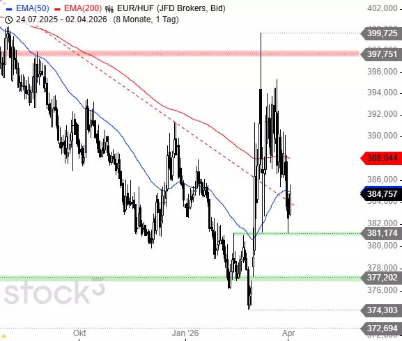 Crashartig rutschte der Euro gegenüber dem Ungarischen Forint zum Wochenstart nach unten, an der Horizontalunterstützung bei 381,17 HUF kam es gestern dann zum bullischen Reversal. Eine Erholungswelle läuft an und könnte auch noch etwas andauern. Wird dieser Support hingegen nach unten durchbrochen, rücken die Jahrestiefs wieder in den Fokus. Übergeordnet dominiert hier noch der Abwärtstrend, die steile Erholung von Anfang März verpufft aktuell wieder deutlich.