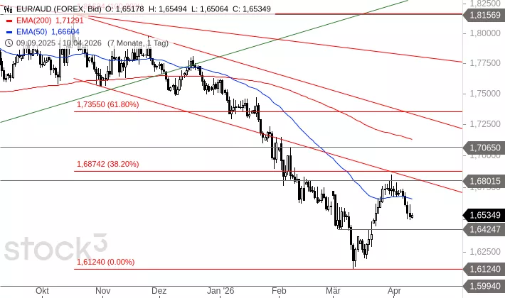 EUR/AUD prallte am 31. März an der Widerstandszone um 1,6802 bis 1,6874 AUD nach unten ab und fällt seitdem deutlich zurück. Diese Abwärtsbewegung kann noch einige Zeit andauern und zu einem Rückfall auf 1,5994 AUD führen. Mit einer kleineren Zwischenerholung ist im Bereich um 1,6425 AUD zu rechnen. Sollte das Währungspaar doch noch über die Widerstandszone ausbrechen, dann könnte es zu einem Anstieg in den Bereich um 1,7065 und 1,7355 AUD kommen.