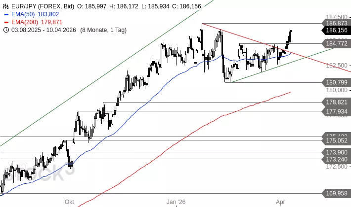 EUR/JPY brach am Dienstag leicht über den Widerstand bei 184,772 JPY nach oben aus. Gestern setzte sich das Währungspaar mit einer langen weißen Kerze nach oben ab. Damit ist der Weg zum Jahreshoch bei 186,873 JPY nicht mehr weit. Überwindet EUR/JPY dieses Hoch, ist Platz für eine Rally in Richtung eine oberen Pullbacklinie bei aktuell 194,045 JPY. Ein Rückfall unter 184,772 JPY könnte aber zu Abgaben bis 180,799 JPY führen.