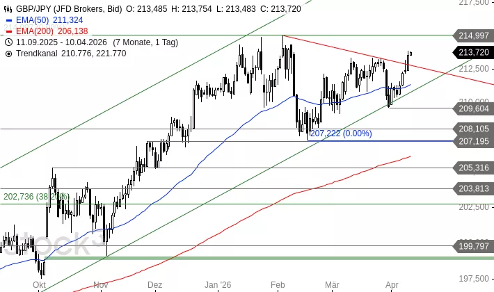 GBP/JPY brach gestern über den Abwärtstrend seit dem Jahreshoch nach oben aus und behauptet sich heute darüber, setzt sich sogar leicht nach oben ab. Damit scheint eine rund zweimonatige Konsolidierung zu Ende zu sein. Das Währungspaar hat jetzt die Chance auf eine weitere Rally bis 223,823 JPY. Sollte das Währungspaar aber wieder in den Abwärtstrend zurückfallen, würden Abgaben bis 209,604 und 207,222 JPY drohen.