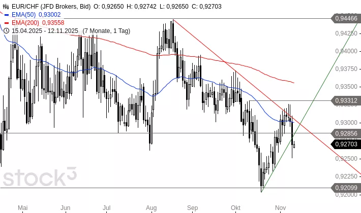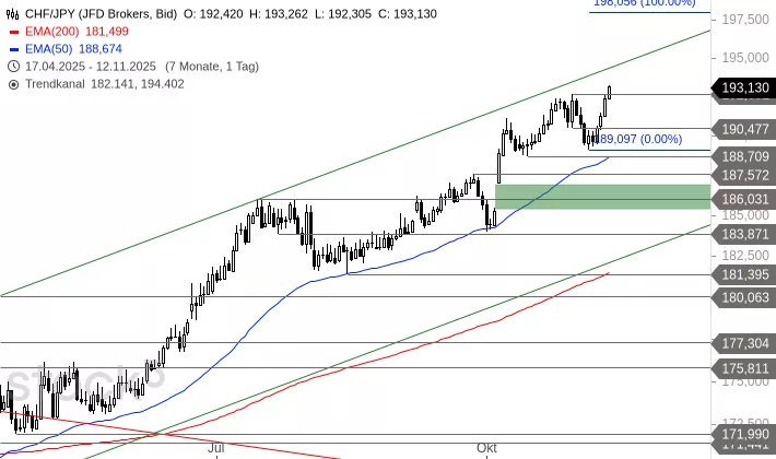 CHF/JPY befindet sich seit Ende Februar 2025 in einer starken Aufwärtsbewegung und kletterte am 30. Oktober auf ein Hoch bei 192,682 JPY. Nach einem Rücksetzer auf 189,097 JPY bricht das Währungspaar heute auf ein neues Rallyhoch aus. Damit besteht die Chance auf eine Fortsetzung der Rally in Richtung 194,402 und später sogar 198,056 JPY. Ein Rückfall unter 189,097 JPY würde allerdings eine Konsolidierung in Richtung 183,871 JPY implizieren.