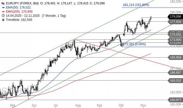 EUR/JPY befindet sich seit Ende Februar 2025 in einer Rally. Dabei kletterte das Währungspaar am 30. Oktober 2025 auf ein Hoch bei 178,821 JPY. Nach einem Rücksetzer auf den EMA50 brach EUR/JPY heute Nacht auf ein neues Rallyhoch aus. Damit deutet sich die Fortsetzung der Aufwärtsbewegung in Richtung eines noch offenen Ziels bei 181,114 JPY an. Fällt EUR/JPY aber unter das Tief vom 05. November bei 176,695 JPY, dann sind Abgaben in Richtung 172,261 JPY möglich.
