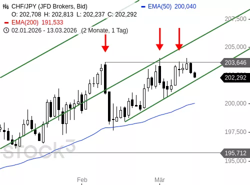Auch ein weiterer Ausbruchsversuch bei CHF/JPY über den Widerstand bei 203,65 JPY blieb erfolglos. Die mehrfach angesprochene kurzfristige Aufwärtstrendlinie rückt nun sehr nahe. Wird sie unterschritten, droht ein Test des EMA50. Auf der Oberseite bleibt es bei der zentralen Barriere bei 203,65 JPY.