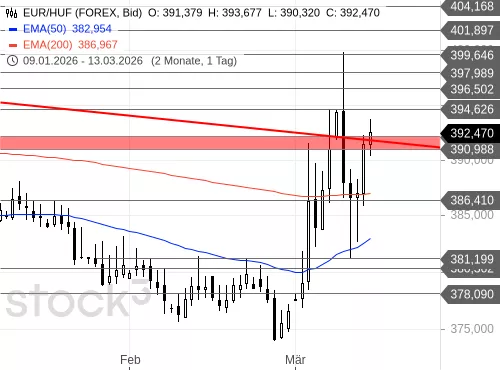 EUR/HUF spulte den beschriebenen Fahrplan perfekt ab. Das Währungspaar sackte zwischenzeitlich bis auf 381,20 HUF, verteidigte den Support aber und notiert nun wieder deutlich höher. Eine Etablierung über 394,63 HUF wäre wichtig, um sich wieder bis auf 400 HUF vorarbeiten zu können.