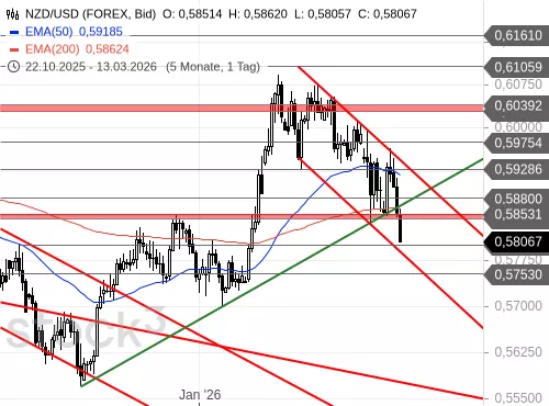 NZD/USD gerät im heutigen Handel deutlich unter Druck und gibt damit die zentrale Unterstützungszone bei 0,5850 USD auf. Die nächsten Supports liegen nun bei 0,5800 und 0,5753 USD. Nur eine schnelle Rückeroberung der Marke von 0,5850 USD könnte eine Korrekturausdehnung zur Unterseite verhindern.