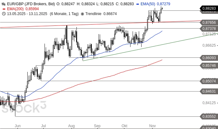 Nach dem Hoch bei 0,8818 GBP vom 29. Oktober 2025 schwenkte EUR/GBP in eine kleine Seitwärtsbewegung ein. Dabei behauptete sich das Währungspaar über der wichtigen Unterstützungszone um 0,8766 GBP. Gestern gelang ein Ausbruch per Tagesschlusskurs aus der kleinen Seitwärtsbewegung nach oben, heute behauptet sich EUR/GBP darüber. Daher ist eine weitere Rally in Richtung 0,8979 GBP möglich. Ein Rückfall unter 0,8818 GBP wäre aber schon ein erster Rückschlag für die Bullen.