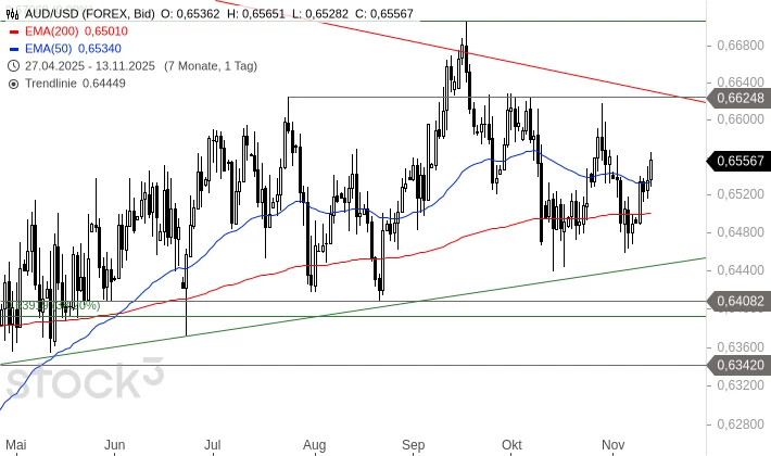 AUD/USD befindet sich seit Ende April in einem flachen Aufwärtstrend. Am 05. November fiel das Währungspaar fast auf diesen Trend zurück. Seitdem zieht es wieder an. Diese Bewegung kann kurzfristig zu weiteren Gewinnen bis 0,6625 USD führen. Ein größeres Kaufsignal entstünde aber erst mit einem stabilen Ausbruch über den dort liegenden Kreuzwiderstand. Ein Rückfall unter den Aufwärtstrend bei aktuell 0,6445 USD könnte allerdings Abgaben in Richtung 0,6342 oder sogar 0,6205 USD auslösen.