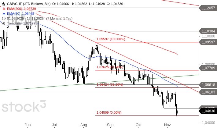 GBP/CHF pendelte nach dem Tief bei 1,0500 CHF einige Tage unterhalb des Tiefs vom 11. April 2025 bei 1,0610 CHF seitwärts. Gestern fiel das Währungspaar auf ein neues Tief ab. Damit wurde die Abwärtsbewegung der letzten Wochen bestätigt. Die kleine Erholung von heute ändert nichts daran. GBP/CHF könnte in den nächsten Wochen in Richtung 1,0160 CHF und damit auf das Tief aus dem Jahr 2022 abfallen. Eine Rückkehr über 1,0500 CHF würde zwar den unmittelbaren Verkaufsdruck abmildern, aber mehr als eine Erholung bis ca. 1,0642 CHF wäre dann auch nicht zu erwarten.