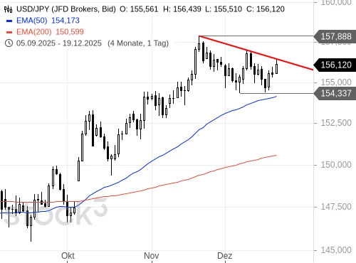 USD/JPY versucht sich aus der Konsolidierung zu befreien, notiert aber noch unter der kurzfristigen Abwärtstrendlinie. Ein Ausbruch darüber könnte den Weg auf 157,88 JPY freimachen. Darüber wäre mittelfristig viel Platz nach oben. Der EMA50 in Verbindung mit dem Tief bei 154,33 JPY stellt auf der Unterseite wiederum die Schlüsselunterstützung dar.