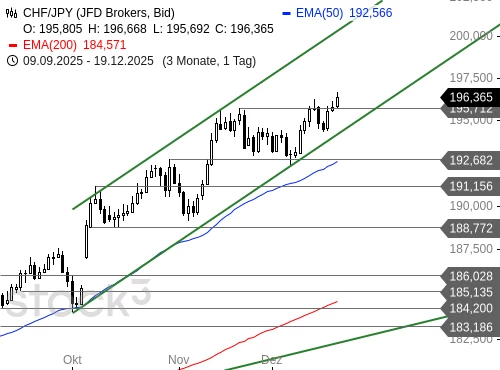 CHF/JPY steigt im heutigen Handel auf ein neues Hoch und könnte damit die mehrwöchige Konsolidierungsphase zur Oberseite auflösen. Ein Projektionsziel liegt bei gut 198 JPY. Mittelfristig sind auch Kurse um 200 JPY erreichbar. Die Marke von 195,71 JPY dient nun als Unterstützung.