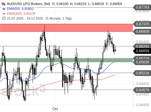 AUD/USD setzt die Konsolidierung fort und nähert sich dem Unterstützungsband um 0,6570 USD an. Dort verläuft auch der EMA50 und könnte nach einem erfolgreichen Test eine Gegenbewegung starten. Auf der Oberseite bleibt die Widerstandszone zwischen 0,6680 und 0,6710 USD maßgeblich.