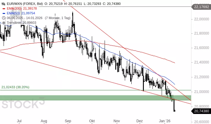 EUR/MXN befindet sich seit April 2025 nach einem Hoch bei 23.5105 MXN in einer Abwärtsbewegung. Dabei fiel das Währungspaar auf die Unterstützungszone um 20,9551 bis 20,8842 MXN zurück. Im gestrigen Handel krachte EUR/MXN mit einer langen schwarzen Kerze unter diese Zone und durchbrach dabei auch eine untere Begrenzung der Abwärtsbewegung seit April. Damit deutet sich eine Verschärfung der Abwärtsbewegung in Richtung 19,6219 MXN an.
