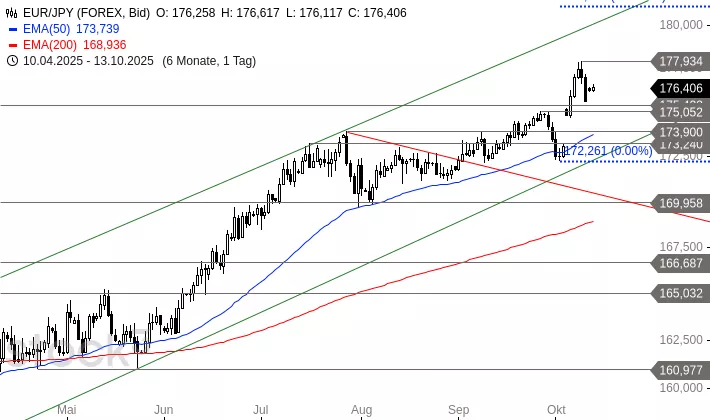 EUR/JPY befindet sich seit Ende Februar 2025 in einer starken Aufwärtsbewegung. Am 08. Oktober 2025 arbeitete das Währungspaar ein Ziel bei 177,68 JPY ab. Nach einem Hoch bei 177,934 JPY setzten Gewinnmitnahmen ein. EUR/JPY näherte sich der Unterstützungszone um 175,422 bis 175,052 JPY an. EUR/JPY kann von dieser Zone aus die Rally fortsetzen und in Richtung 181,114 JPY ansteigen. Ein Rückfall unter diese Zone würde auf Abgaben in Richtung 172,261 JPY hindeuten.