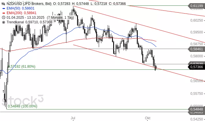 NZD/USD befindet sich seit dem Jahreshoch bei 0,6120 USD in einer Korrekturbewegung und fiel dabei am Freitag minimal unter eine untere Begrenzung dieser Bewegung und auf das log. 61,8%-Retracement der Rally ab 09. April 2025 bei 0,5719 USD zurück. Dort fängt sich das Währungspaar heute wieder. Steigt NZD/USD über 0,5754 USD an, dann kann es sich bis an den Abwärtstrend seit dem Jahreshoch bei aktuell 0,5971 USD erholen. Kommt es aber zu einem Rückfall unter das Tief vom Freitag, dann sind weitere Abgaben bis ca. 0,5485 USD möglich.