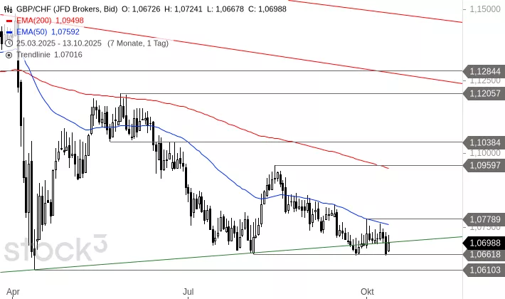 GBP/CHF pendelt seit Tagen um den Aufwärtstrend seit September 2022. Dabei testete das Währungspaar die Unterstützung bei 1,0662 CHF und kletterte im Hoch auf 1,0779 CHF. Am Freitag kam es zu einem weiteren Test dieser Unterstützung. Heute hält sie bisher. Bricht GBP/CHF über 1,0779 GBP aus, ist eine Rally in Richtung 1,0960 CHF möglich. Sollte das Währungspaar aber unter 1,0662 CHF abfallen, müsste mittelfristig mit Abgaben in Richtung 1,0610 und 1,0160 CHF gerechnet werden.