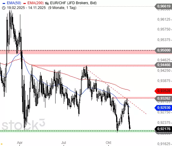 In einem brutalen Abverkauf befindet sich seit Tagen der Euro gegenüber dem Schweizer Franken. Das Währungspaar steht nun wieder an den Tiefs aus 2024 und 2025 und damit am ultimativen Support. Wird dieser nachhaltig gebrochen, entstehen große Verkaufssignale. Zunächst wären hin aber Stabilisierungsversuche und kleinere Erholungen möglich.