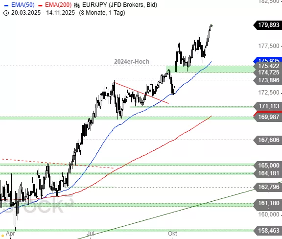 In einem steilen Rallytrend zieht der Euro gegenüber dem Japanischen Yen auf neue Mehrjahreshochs hinauf. Zwischenkorrekturen wären hier in Kürze denkbar und sollten idealerweise auf hohem Niveau verlaufen. Unterstützung bietet das letzte Zwischenhoch bei 178,82 JPY. Anschließend könnte es weiter gen Norden gehen.