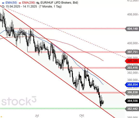Innerhalb des mittelfristigen Abwärtstrends hat der Euro gegenüber dem Ungarischen Forint zu Wochenbeginn beinahe das Tief aus dem Mai 2024 erreicht. Oberhalb davon läuft eine Stabilisierungsbewegung. Eine Kurserholung in Richtung des Septembertiefs und darüber hinaus zum EMA50 und zur Trendkanaloberkante wäre in Kürze denkbar. Unklar ist, ob zuvor der Support bei 382,00 - 382,44 HUF noch getestet wird.