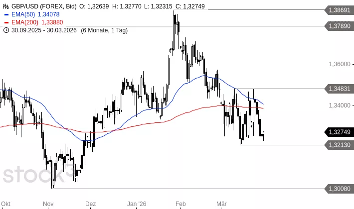 EUR/USD fiel heute Nacht auf den Aufwärtstrend seit 13. März 2026 zurück. Dieser Trend bot Unterstützung. EUR/USD drehte nach oben ab. Dieser Trend liegt aktuell bei 1,1486 USD. Allerdings ist der kurzfristige Abwärtstrend, der vom EMA50 (Stundenbasis) verstärkt wird, ebenso intakt. Dieser verläuft aktuell bei 1,1528 USD. EUR/USD ist zwischen diesen beiden Trendlinien eingeklemmt.