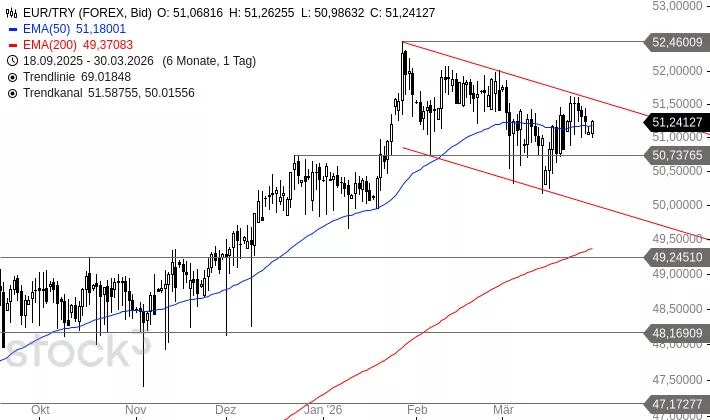 EUR/TRY markierte am 27. Januar 2026 das aktuelle Allzeithoch bei 52,4601 TRY. Seitdem konsolidiert das Währungspaar in einer bullischen Flagge. In der letzten Woche scheiterte es an der Oberkante der Flagge. Verkaufsdruck zeigt sich aber bisher nicht. Ein Ausbruch aus der Flagge, also über 51,5876 TRY, würde den Weg zu einer Rally bis 53,1281 TRY ebnen. Solange dieser Ausbruch aber fehlt, muss mit einer anhaltenden Konsolidierung in Richtung 49,88 oder sogar an den EMA200 bei aktuell 49,3701 TRY gerechnet werden.