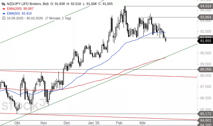 NZD/JPY lief nach dem Tief vom 23. Februar 2026 in einer Range zwischen 92,923 und 93,864 JPY seitwärts. Heute Nacht fällt das Währungspaar aus dieser Range nach unten heraus. Damit deutet sich eine weitere Abwärtswelle in der Konsolidierung seit 09. Februar 2026 an. NZD/JPY könnte dabei auf den Aufwärtstrend seit April 2025 bei aktuell 90,165 JPY abfallen. Eine schnelle Rückkehr über 92,923 JPY würde die Chance auf einen Anstieg bis 93,864 und 94,914 JPY eröffnen.