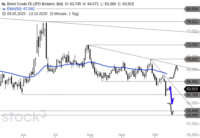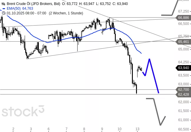 Die bärische Flaggenformation der Vortage hat sich am Freitag klar durchgesetzt. Es kam zu einem dynamischen Ausbruch nach unten, der den Ölpreis direkt bis zur Unterstützungszone bei 62,70 USD führte. Von dort konnten sich die Notierungen zuletzt leicht nach oben lösen.