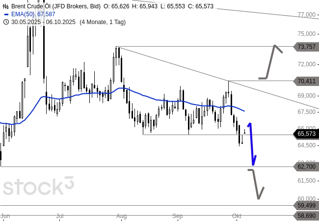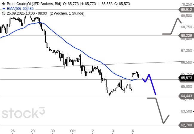 Der laufende Pullback nach dem Rückfall der vergangenen Handelstage muss noch keine Trendwende einleiten. Eine anhaltende Rückeroberung der 65,46 USD bliebe dafür abzuwarten. Zunächst besteht weiterhin die Möglichkeit, dass sich die Abwärtsbewegung über die kommenden Tage fortsetzt. Weitere Abgaben bis 62,70 USD sind jederzeit möglich. Gelingt dagegen eine nachhaltige Stabilisierung oberhalb von 65,46 USD, gegebenenfalls auch eine Rückeroberung des flachen Aufwärtstrends bei rund 66,50 USD, wäre eine Erholung bis 68,00 USD denkbar.