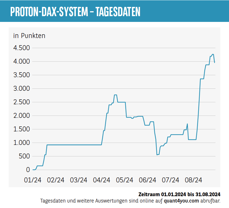 Aber wann geht man long, wann short und wann macht man einfach mal nichts? Trading ist schwierig, und es ist doch verlockend für viele Anleger, da man mit Hebelprodukten schnell viel Gewinn erzielen kann – viel mehr als vielleicht mit „langweiligem“ Investieren in einen ETF. Täglich versuchen sich unzählige private und professionelle Anleger am Markt. Es werden Bewegungen antizipiert, und es wird etwas in den Markt hineininterpretiert, was da sein könnte, aber vielleicht gar nicht da ist. Der diskretionäre Handel ohne Sinn und Verstand führt häufig zu keinem guten Ergebnis. Natürlich spielt die Emotion von Gier und schnellen Gewinnen häufig mit. Insbesondere dann, wenn das Depot vielleicht noch klein ist und man schnell reich werden will. Wer diesen Artikel liest und sich ertappt fühlt, sollte einfach mal selbst kritisch reflektieren, ob man es nicht einmal anders machen sollte. Nicht ohne Grund kommen viele Anleger nach einer verlustreichen Probierphase am Aktienmarkt – beispielsweise mit dem Handel von Optionsscheinen und Knock-outs auf den DAX – zu Quant4you, um ein systematischeres und entspannteres Traderleben zu führen. Auch im August haben wir das wieder erleben dürfen. Einmal richtig runter im DAX, und dann vom Tief 2.000 Punkte hoch. Waren Sie dabei? Vielleicht in der ersten Aufwärtsbewegung, aber wahrscheinlich haben Sie nach 300 Punkten schon wieder glattgestellt. Warum ? Weil Sie vielleicht gedacht haben, der Markt könnte nochmals kippen, oder Ähnliches. Klar kann der Markt das tun. Niemand weiß das, aber wenn man so handelt, wird man nicht erfolgreich, weil das System fehlt. Ein System ist wichtig. Ein System hilft zu verstehen, warum man gewinnt und warum man verliert. Ein System ist die Basis für Erfolg an der Börse. Bitte nicht ohne System aktiv traden. Das Proton-System hat auch im August wieder vielen Anlegern geholfen, Geld zu verdienen. Mit System und mit Logik. Selbst wir waren verblüfft über die Performance und freuen uns für viele, die das System nutzten und damit erfolgreich waren. Allein im August konnte Proton 2.850 DAX-Punkte erwirtschaften. Mit dem Mini-DAX sind das über 10.000 Euro Gewinn. Das sind die Marktphasen, die man mitnehmen muss.